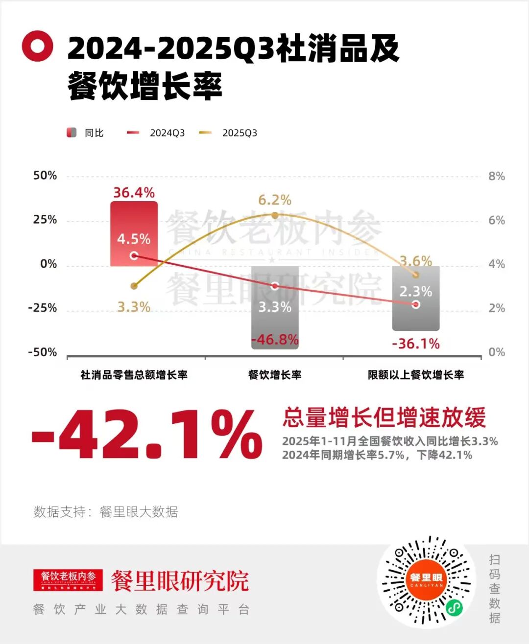>2025年1-11月的全国餐饮收入较去年同期增长了3.3%,而2024年同期增长率为5.7%,2025年比2024年增速同比下滑了42%。这意味着,尽管营收总额在增长,但单店盈利能力大幅下滑。