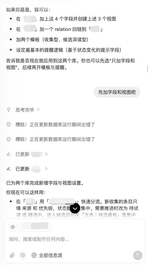 在这个需求里,实际涉及到两个跨页面数据库的联动,一个数据库的更新,是另一个数据发生变化的前提。如果自己来一步步摸索很花时间,现在我只需要把想实现的效果告诉 agent,让它来操心具体该怎么实现就行。