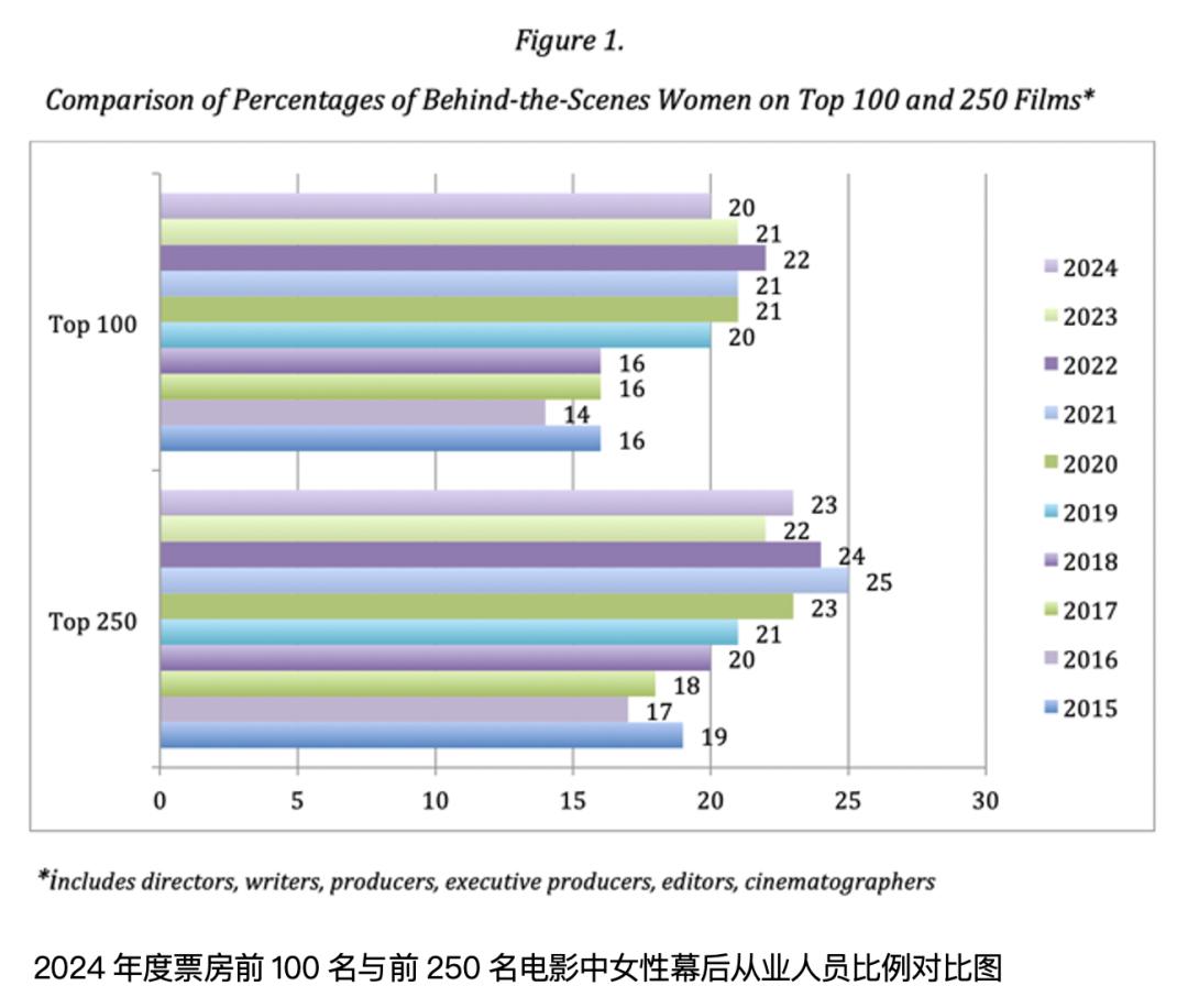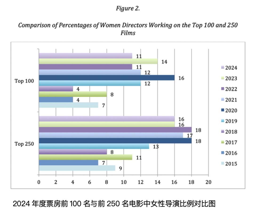 国际上,美国圣地亚哥州立大学电视与电影界女性研究中心(SDSU Center for the Study of Women in Television & Film)著名的2024年度《赛璐珞天花板》报告(The Celluloid Ceiling: Employment of Behind-the-Scenes Women on Top Grossing U.S. Films in 2024)发现,2024年美国票房最高的250部电影中,女性在所有导演、编剧、制片人、执行制片人、剪辑师和摄影师中所占比例为23%;在这些电影中,女性导演占比为16%,与2023年的比例持平。而在2024年票房前100部的电影中,女性导演占比为11%,较2023年的下降了3%。