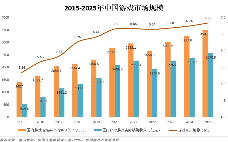 2015年,中国游戏市场规模达到1407亿元,游戏用户数达到5.34亿人。2025年,国内游戏市场实际销售收入3507.89亿元,用户规模6.83亿,达到了有史以来新高点。