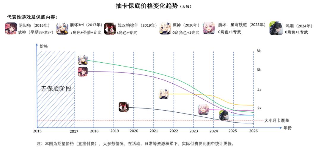 从17年开始,抽卡保底价格从6-8k逐渐降低至2k左右,且不同游戏之间付费差距逐渐减少。而未来价格变化,也逐渐靠拢大小月卡线(即:只需大小月卡+日常活跃,便基本可以覆盖主流角色的抽取成本)。