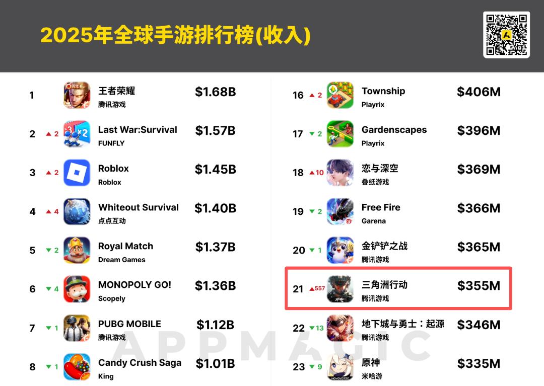 《Gossip Harbor》《Clash Royale》《三角洲行动》《Toon Blast》《穿越火线-枪战王者》以及榜单上唯一的2025年新作《Kingshot》(奔奔王国)全年收入表现亮眼,均首次进入年度收入TOP30。