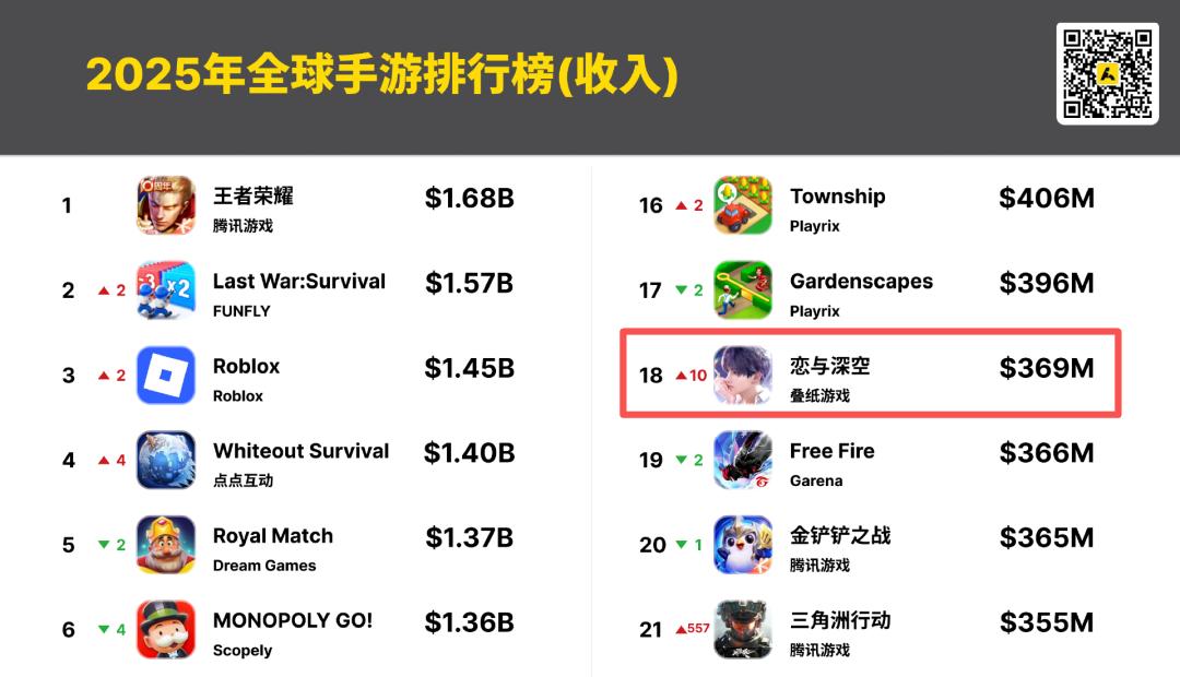 叠纸的《恋与深空》排名第18,2025年全球总收入超3.69亿美元(约人民币26亿元),同比增长36%。