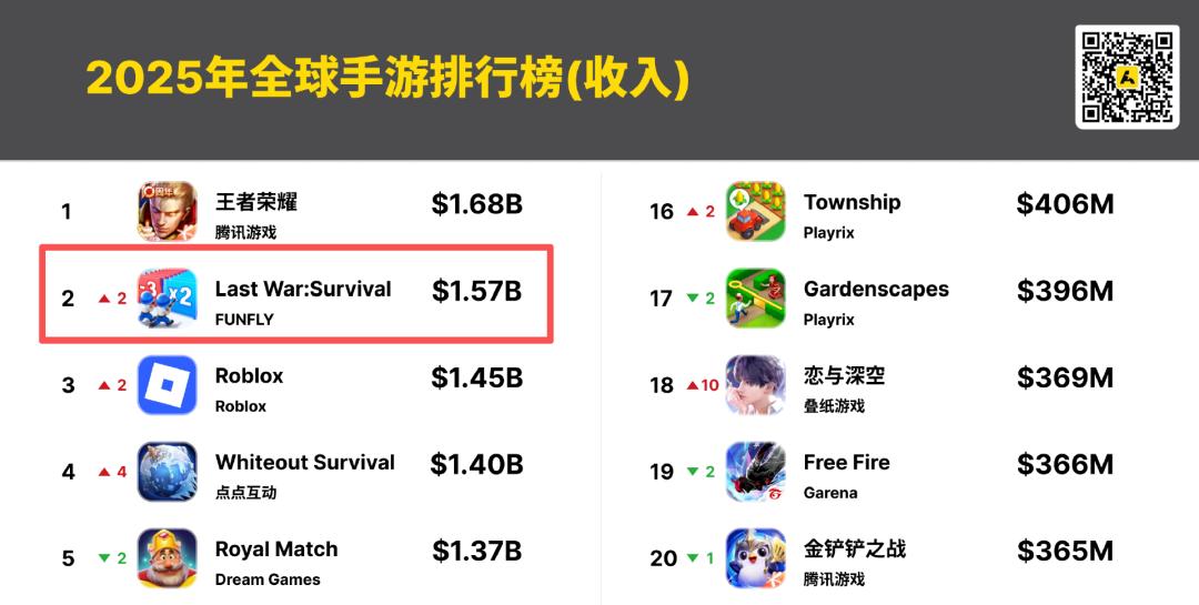 其中,《王者荣耀》再次蝉联榜首,《Whiteout Survival》(无尽冬日)年度收入增幅约50%,成为10亿美元梯队的增长冠军。