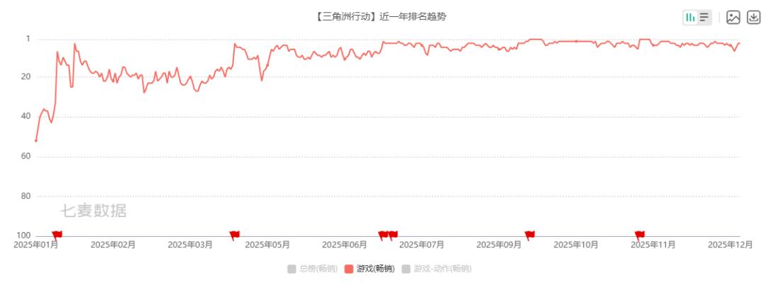2025年7月,《三角洲行动》首次进入全球手游收入榜,随后便长期稳居榜单TOP17以内,11月甚至冲上榜单TOP10。2025年下半年,该游戏在中国App Store游戏畅销榜中的排名基本稳定在TOP5。