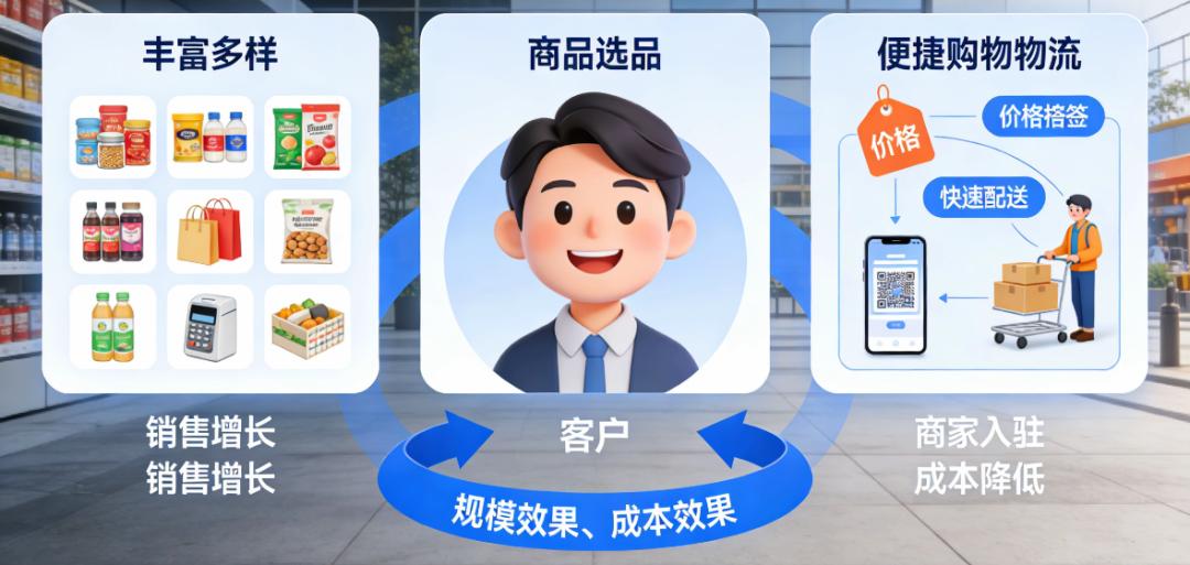 亚马逊的商业帝国是围绕类似“飞轮效应”的增长模型建立的:以客户体验为中心,提供更丰富的选品、更低的价格和更便捷的体验,从而吸引更多客户;更多的客户带来销售的增长,吸引更多商家入驻、形成规模效应,随后进一步降低成本,再将节省的成本返还给客户,形成不断加速旋转的增长闭环。