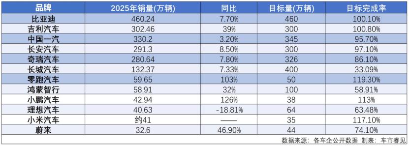 这一年,比亚迪以460.24万辆的年销量继续领跑全行业,吉利、奇瑞等传统自主品牌凭借新能源转型提速和全球化布局实现跨越式增长;与此同时,造车新势力阵营经历了一场剧烈的座次洗牌,“蔚小理”集体暂时退居二线,取而代之的是零跑、鸿蒙智行(以问界为主)与小米“新三角”的崛起。