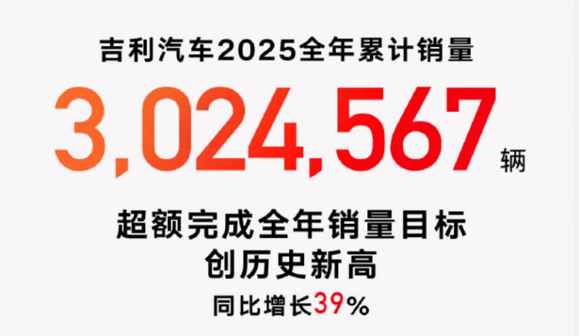 吉利汽车全年销量302.46万辆,同比增长39%,超额完成300万辆的年度目标。吉利的高速增长源于其多品牌战略的成功落地与新能源转型的全面提速。旗下银河品牌年销123.6万辆,同比激增150%,成为最快达成百万年销量的新能源汽车品牌;极氪与领克分别贡献22.4万辆和35万辆,在高端智能电动领域站稳脚跟。吉利通过吉利、银河、领克、极氪等品牌覆盖从经济型到豪华型的全价格带,并依托与沃尔沃、路特斯的技术协同,构建起灵活且富有韧性的产品矩阵。