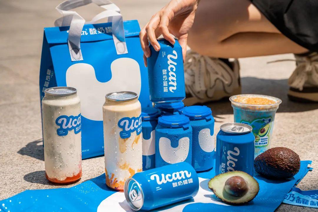 2023年4月29日,酸奶罐罐首店在上海美罗城开业。品牌定位同样瞄准“健康”,主打“酸奶+水果+轻食化”的组合,在视觉呈现、门店风格和产品命名上都明显偏年轻化、社交化。比如在产品形态上,牌如其名——酸奶罐罐,其把酸奶装进克莱因蓝的易拉罐里,一眼吸睛。