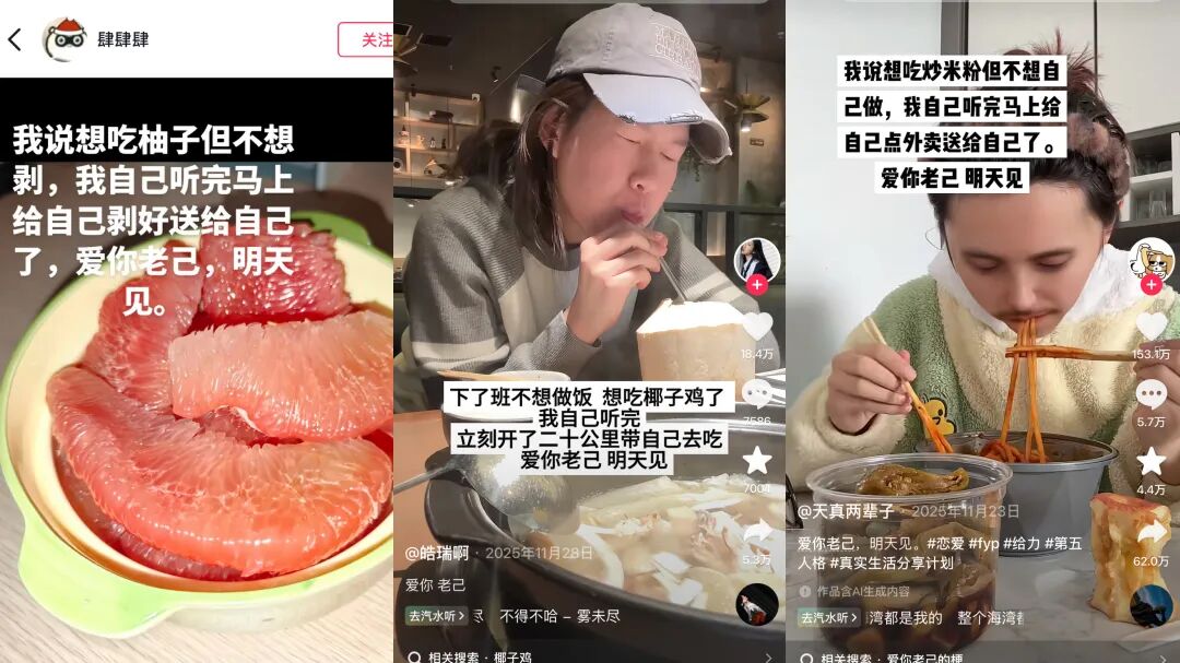 大众公认梗的源头是一名抖音博主@肆肆肆,在视频中,她想吃柚子但不想剥,自己听到后马上把柚子剥得干干净净送给自己吃,还不忘配文“爱你老己,明天见”。这种离奇的组词方式立刻引发了年轻人共鸣。