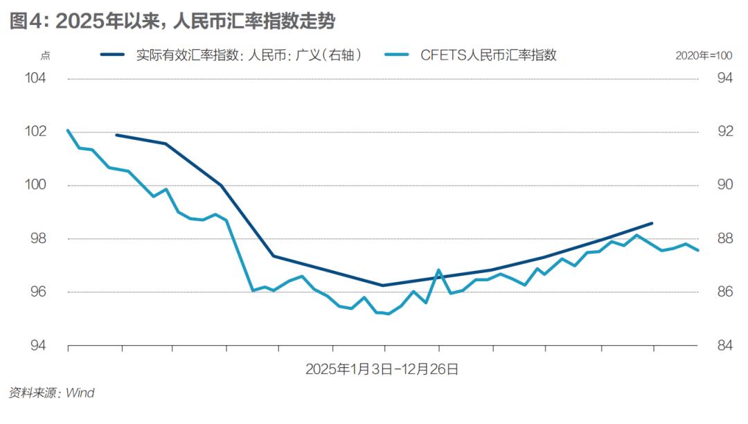 2025年5月以来,在美元指数震荡整理、大多数非美货币兑美元汇率冲高回落的背景下,人民币开始补涨,并不断刷新2024年9月以来的高点。截至12月26日,人民币中间价较2024年底累计升值2.2%,在岸人民币升值约4.1%,离岸人民币升值约4.8%,三个价格均升至7.0附近。