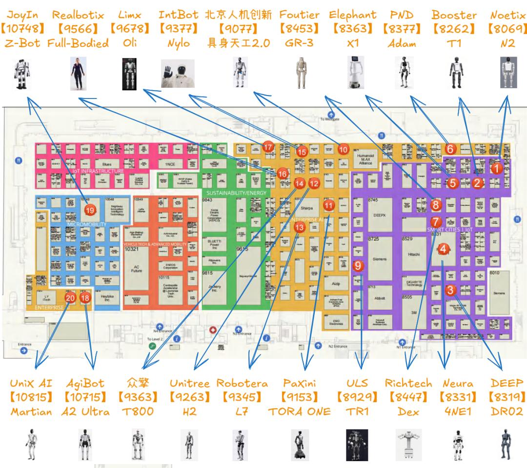 CES2026 人形机器人品牌展位分布。作者:郎瀚威@AIWatch.ai