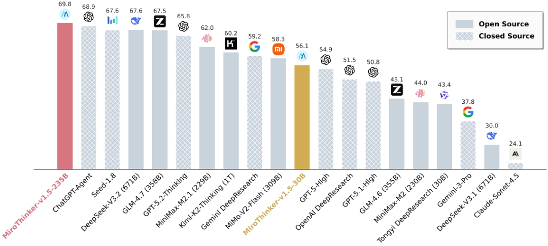 MiroThinker-v1.5-30B 仅用 1/30 的参数规模跑出了比肩众多 1T 模型的性能表现,其 235B 的版本在多个搜索智能体基准测试中跻身全球第一梯队。