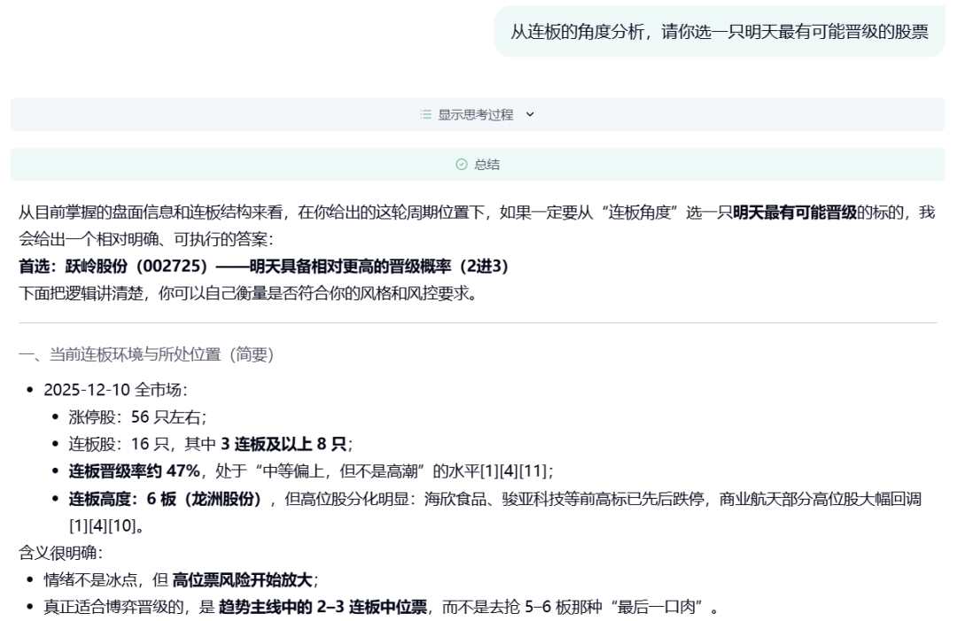 o 跃岭股份 | 16 只连板股,当天晋级仅 4 只,晋级率 25%,市场情绪显著退潮。MiroMind 在 8 支二板股里,精准押中唯一晋级成功的那一支。
