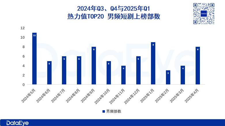 DataEye数据显示,2024年第三季度至2025年4月,在国内微短剧热力值TOP20榜单中,男频题材共上榜52部,占比26%,男频短剧的产量也从521部持续回落至目前的312部,市场持续低迷。