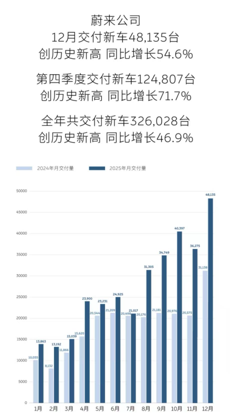 从年末表现看,蔚来的走势明显转强。2025年12月,公司交付量达48135辆,同比增长54.6%。其中,蔚来品牌交付31897辆,乐道9154辆,萤火虫7084辆,多品牌开始在交付数据中体现存在感,体系运转的复杂度也随之上升。
