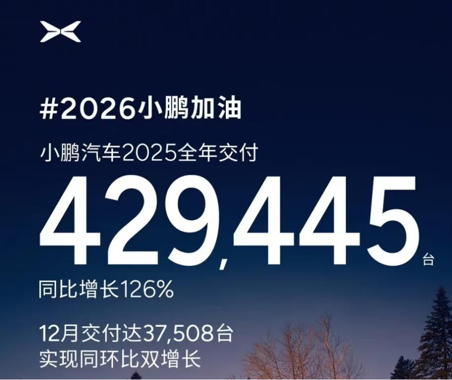 2025年,小鹏(XPEV.US)全年交付近43万辆,同比增长126%,超额完成38万辆目标。从全年曲线看,小鹏实现了高速增长,但在最后两个月,销量并未继续冲高。9月—10月,小鹏汽车月销一度接近4万辆后,MONA M03、P7+ 等主力车型出现回落,全新P7在短暂拉升后同样下滑。