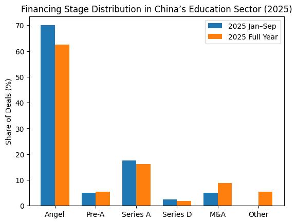 从融资轮次结构来看,2025 年教育行业并非简单地「偏向早期」,而是呈现出一个随时间演化的双轨结构。这一特征在将 2025 年 1–9 月与全年数据放在一起对比时,表现得尤为清晰。
