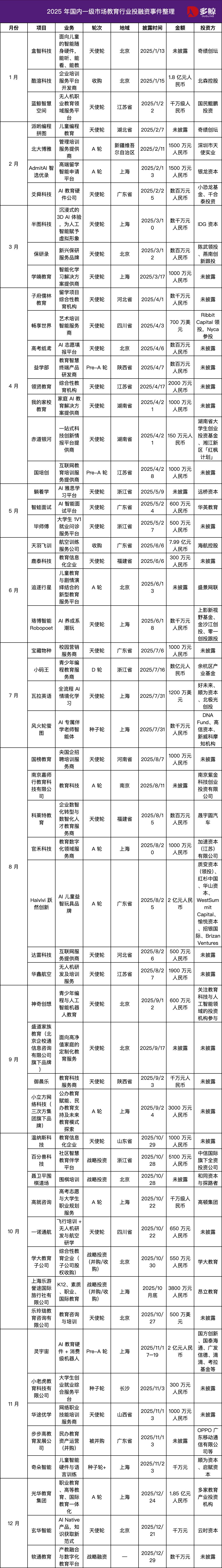 这一年留下的,并不是几个明星项目或亮眼数字,而是一套更清晰的判断标准:什么阶段可以投、投多少钱合适、投向哪些业务、发生在哪里、由谁来投。对教育行业而言,这种结构性的明确,或许比短期的热度更具长期意义。
