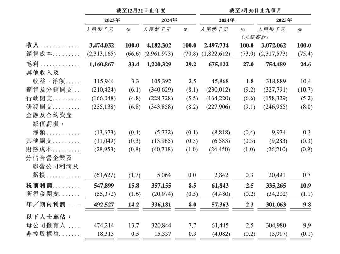 招股书显示,2023-2024年及2025年前三季度,星星充电的营业收入分别约34.74亿、41.82亿、30.72亿元;毛利分别约11.61亿、12.20亿、7.54亿元,毛利率分别为33.4%、29.2%、24.6%;净利润分别约4.93亿、3.36亿、3.01亿元。