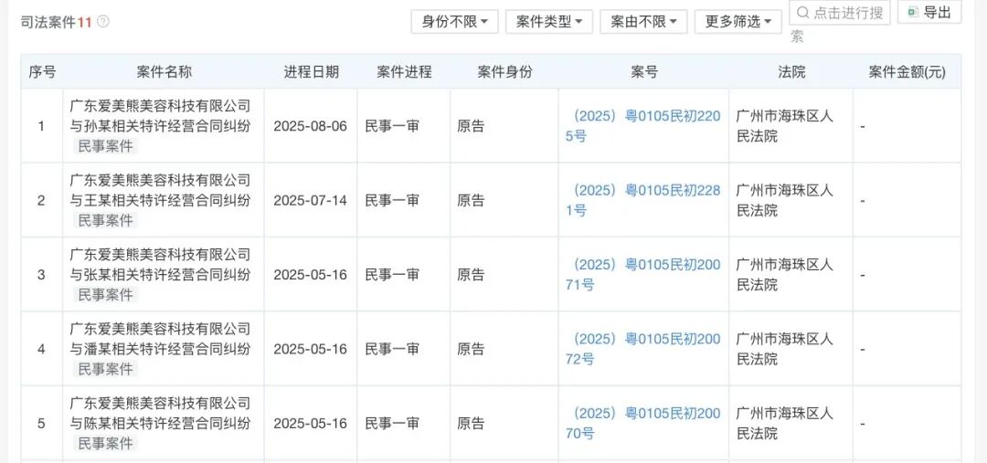 2025年,洗脸熊品牌总部与加盟商之间的矛盾进一步显化。天眼查显示,广东爱美熊美容科技有限公司在2025年5月~8月,以原告身份陆续发起11则特许经营合同纠纷民事诉讼。
