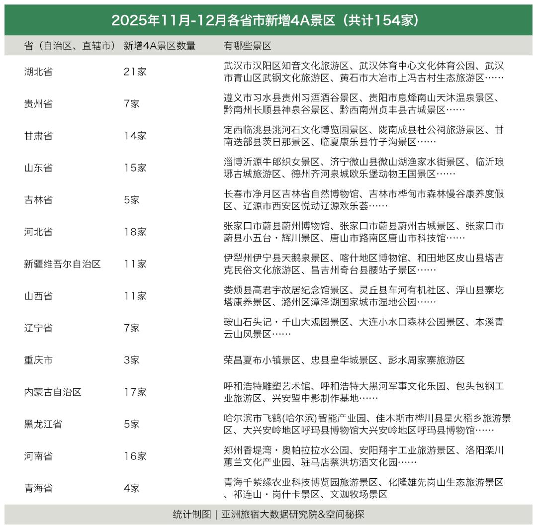 过去两个月,山西、贵州、甘肃、山东、河北、河南、吉林等14个省、市,相继公布新一批国家4A级旅游景区名单,合计新增154家。从节奏上看,这更像是一场集中完成的年度工程,也让“4A景区密集上新”在年底成为业内高频话题。