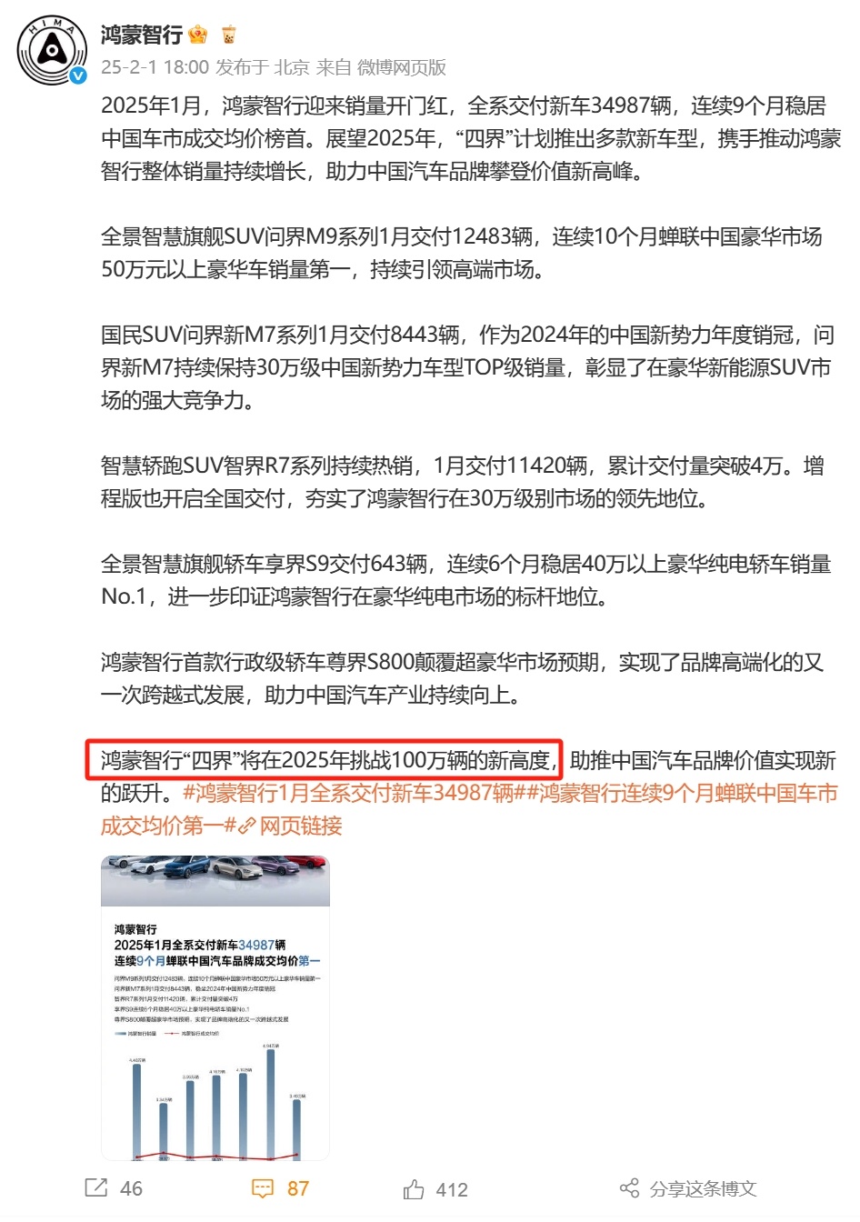 事实也印证了这一判断——截至2025年10月28日,鸿蒙智行正式宣布全系累计交付量突破100万辆,达成这一里程碑仅用了43个月。