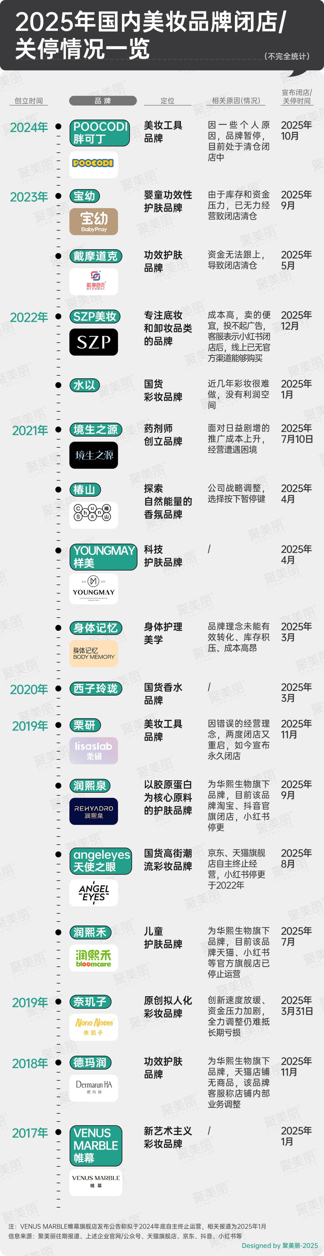 根据公开资料信息,聚美丽不完全梳理了2025年关停的国货美妆品牌境况,发现已有17个,这些品牌创立时间均在2017-2024年之间,而存活年限最长不超过8年,最短仅1年,大致可分成三类:国内头部美妆集团旗下品牌、医研共创品牌、中小企业品牌。
