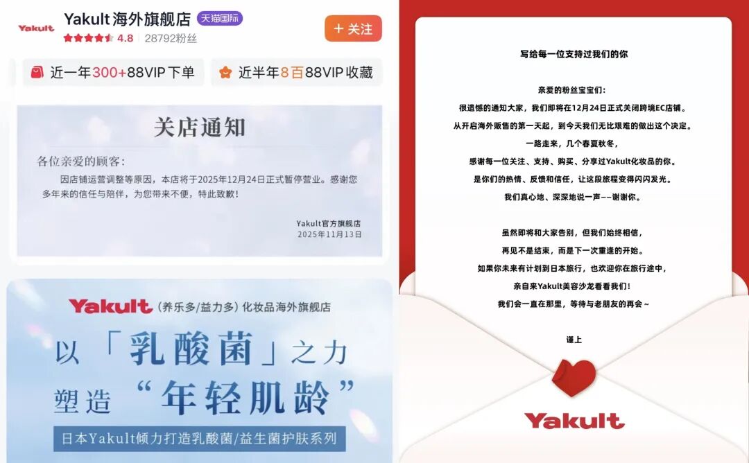此外,跨界而来的日妆品牌也难逃“闭店劫”。就在前段时间,养乐多集团旗下乳酸菌个护品牌Yakult在其官方小红书、天猫国际海外旗舰店(粉丝数为2.88万)均发布闭店通知,宣布于12月24日正式关闭跨境EC店铺,其表示此系“无比艰难的决定”,这也意味着其结束超5年的在华的海外贩售,将专注于日本市场。