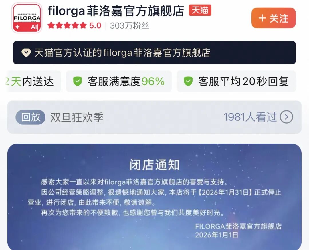 近期,高露洁旗下法国院线护肤品牌Filorga菲洛嘉在2026年1月1日发布公告,宣布品牌天猫官旗闭店,表示将于本月底“正式停止营业”。