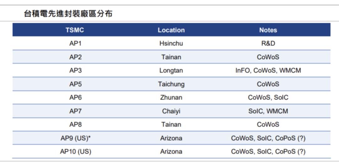 据报道,台积电的先进封装厂区广泛分布,包括龙潭(AP3)、台中(AP5)、竹南(AP6)、嘉义(AP7)、台南(AP8)等。其中,AP8 的扩产加速主要用于满足CoWoS-L 的需求,而嘉义的AP7 则专注于SoIC 和WMCM。在美国亚利桑那州(Arizona)的AP9 和AP10 厂区,未来规划亦将包含CoWoS、SoIC 及CoPoS 技术。