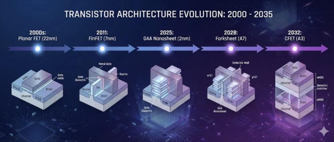 纳米片之后的路线图很明确:叉状片(预计在 2028 年左右)在 n/p 器件之间引入介电壁以实现更小的间距,然后CFET (预计在 2032 年左右)将 nMOS 直接垂直堆叠在 pMOS 上。