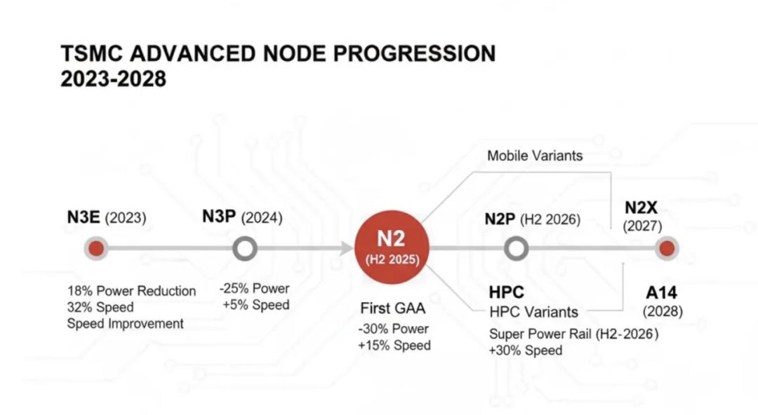 相关报道指出,台积电表示,2 纳米技术已如期于2025 年第四季开始量产。 N2 技术采用第一代纳米片(Nanosheet) 电晶体技术,提供全制程节点的效能及功耗进步,并发展低阻值重置导线层与超高效能金属层间电容以持续进行2 纳米制程技术效能提升。