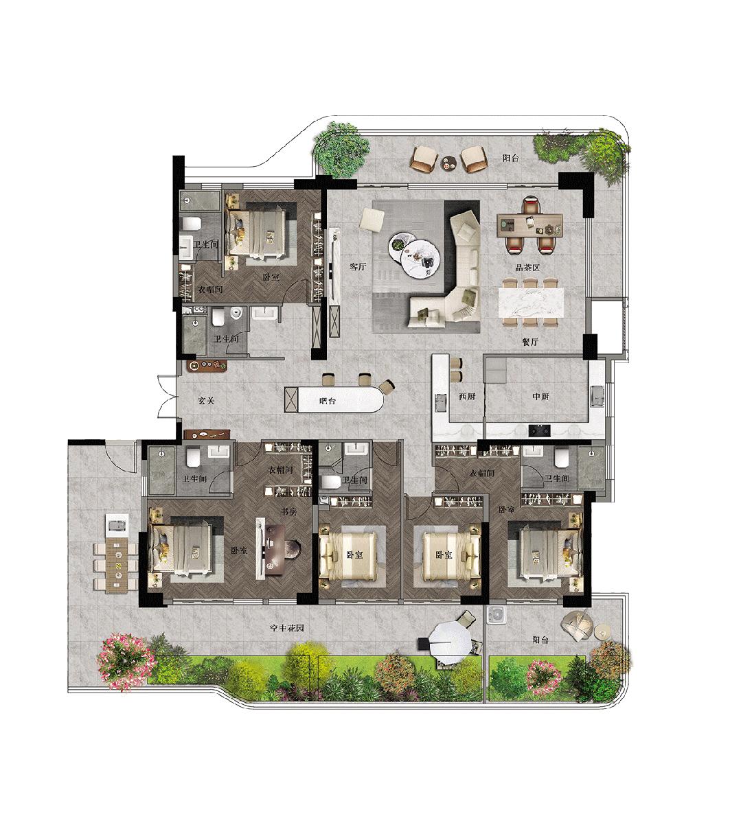其中,以“平层墅院化”为特征的第四代住宅在各地兴起,大平层融合了别墅特有的庭院、露台等功能空间,既拥有大平层的尺度及视野,又同时享受别墅般“有天有地”的庭院生活。
