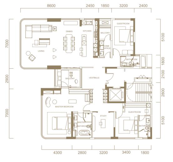 如下面这个230㎡的户型,就以新型的“U型全景舱”悬浮结构替代传统L型转角,形成了77㎡的LDK家庭聚厅,连续落地窗面宽达到14.5米、采光面更是长达21.3米,无柱化设计实现270°环幕视角,整个空间犹如透明盒子般通透。