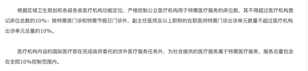 其次,国际医疗部作为国内医院的特需服务,规模受到政策严格限制,即不得超过医院总服务量的10%。以2021年发布的《北京市卫生健康委员会关于 加强和规范北京市公立医疗机构特需 医疗和国际医疗服务管理的通知》为例,其中就明确标明: