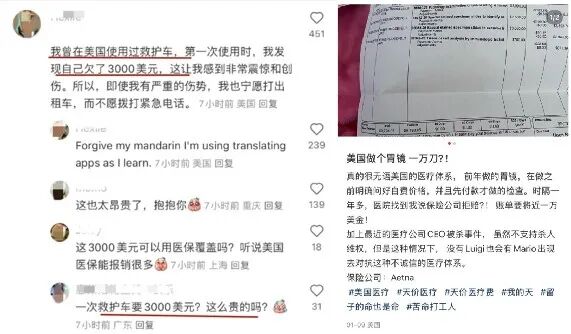 真正让“老外来中国看病”彻底引爆的关键性事件,是2025年初“美国封禁TikTok”引发的中美网友情报大对账。当时大批美国“TikTok难民”涌入小红书、抖音等中国社交媒体,中美网友之间在方方面面展开前所未有的情报大对账,其中让最美国网友破大防的一项就是中美医疗差异。有中美网友从救护车、口腔、手术费、检查费、生育费、诊疗效率等方面对两国医疗花费进行了详细比较: