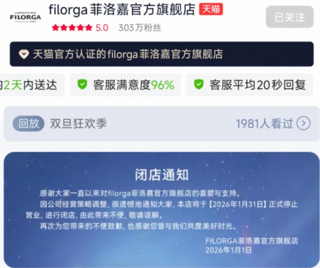 2026年1月31日,法国功效护肤品牌菲洛嘉(Filorga)将正式关闭其天猫官方旗舰店。