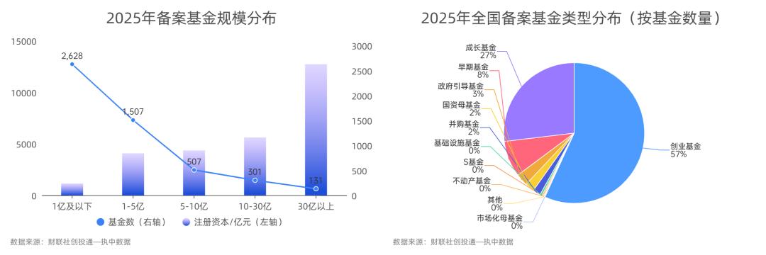 从备案基金规模来看,新备案基金以小规模基金为主,注册资本在1亿元及以下的基金数占比约50.91%,1-5亿元之间的占比29.19%,较2024年分别提高0.79和1.35个百分点;而30亿元以上的基金占比则由3.47%下降至2.54%;市场进一步向小规模基金倾斜。