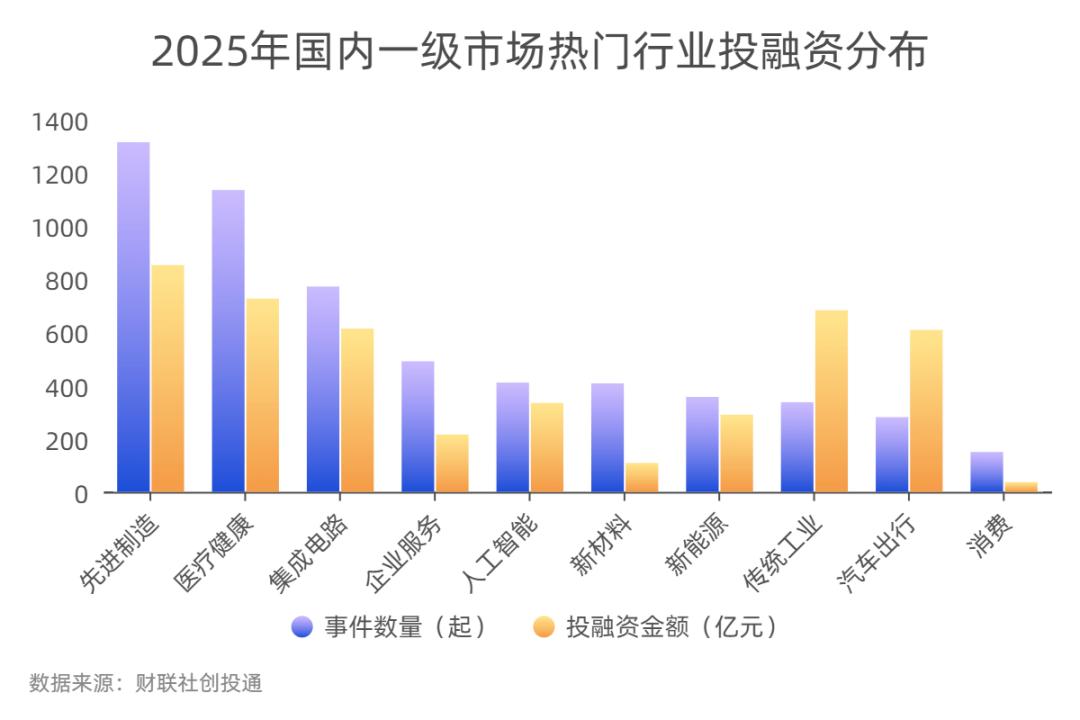 2025年,先进制造以1315起投融资事件、852.77亿元融资总额保持领先。医疗健康则以1135起融资、726.68亿元融资额位居第二。从投融资事件数来看,2025年排名前五的行业分别为:先进制造、医疗健康、集成电路、企业服务、人工智能。从披露的融资总额来看,排名前五的行业分别为:先进制造、医疗健康、传统工业、集成电路、汽车出行。