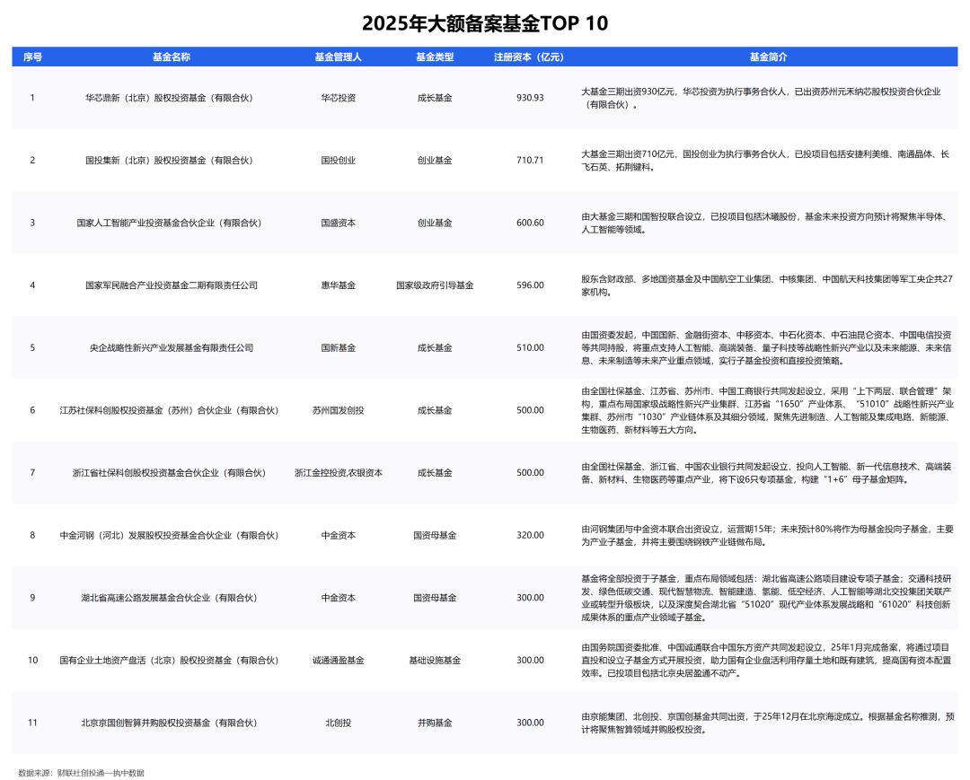 2025年,随着国家及各地产业政策对战略性新兴产业及未来产业的进一步支持,各级国资主导的大额基金纷纷完成设立及备案。