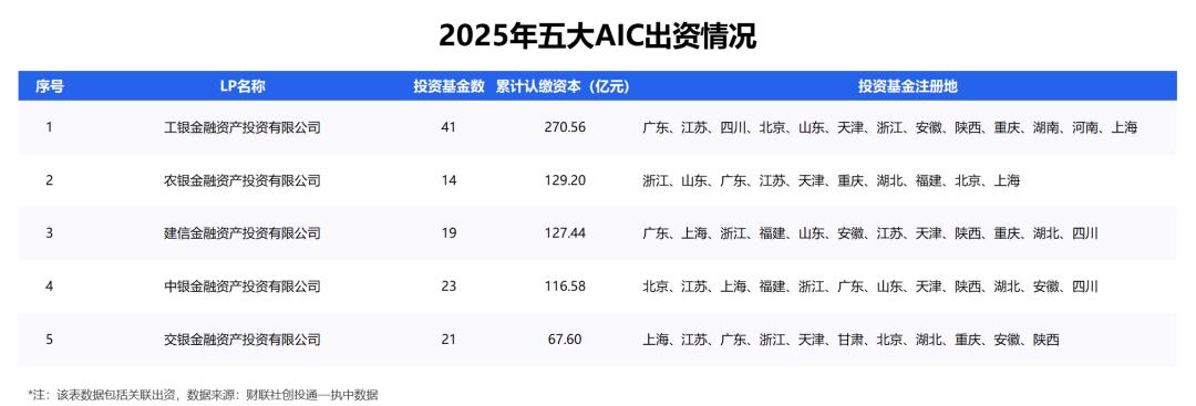 随着政策陆续出台支持AIC开展股权投资,扩大AIC股权投资试点投资地域,支持符合条件的商业银行发起设立金融资产投资公司,五大AIC纷纷于各试点城市签约设立股权投资基金,同时兴业银行、中信银行、招商银行等也陆续获批筹建AIC。若考虑关联出资,2025年五大AIC出资备案基金规模已超710亿元。