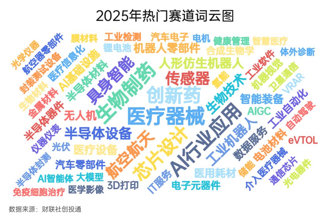 从细分赛道来看,先进制造领域各类型机器人、传感器、航空航天出现频率居前;医疗健康领域继续以医疗器械、创新药为主;集成电路领域中,芯片设计、半导体设备、半导体材料持续受关注。与2024年相比,航空航天、人形仿生机器人、具身智能、工业机器人活跃度一路攀升,纷纷跻身热门赛道。