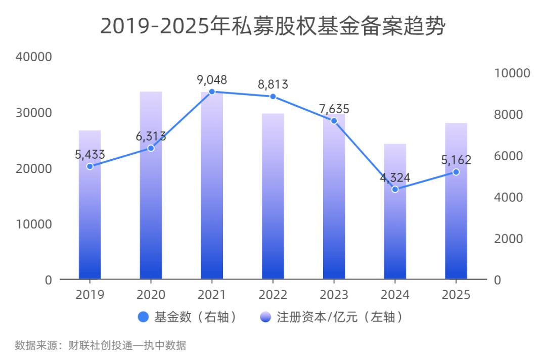 2025年,新备案的中国私募股权投资基金共计5162支,注册资本总额约2.79万亿元,较2024年分别同比增长19.38%和15.49%;备案基金数近四年来首次回升。从基金注册地来看,浙江、江苏、广东、山东四省备案基金数继续保持前四位,累计占比57%;从备案基金规模来看,北京、浙江、江苏、上海四地区备案基金注册资本均超2000亿元,累计占比54%。