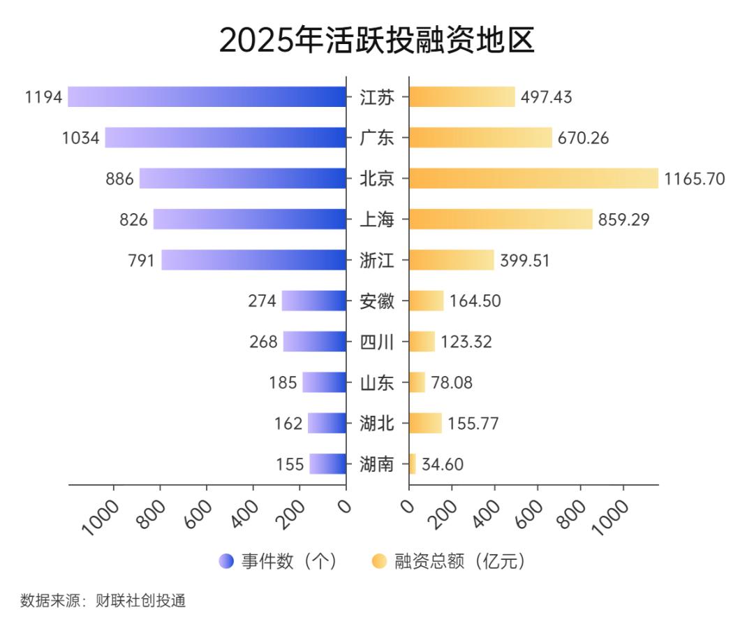 从地区来看,2025年江苏投融资事件数近1200起,活跃度继续保持首位;北京地区的公司披露融资总额最高,超1165亿元,与国网新源、新石器等大额融资事件有关。
