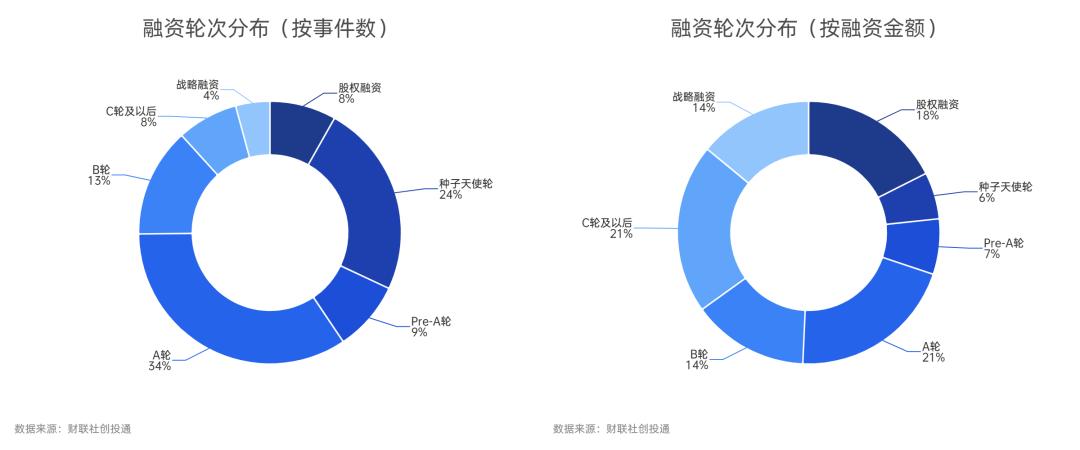 从投资轮次来看,2025年A轮融资事件数最多,占比约34%;其次是种子天使轮,占比约24%;早期项目(A轮及以前)获投次数占比67%,较2024年进一步提升。从各轮次获投金额来看,C轮以及后最高,约995亿元,其次是A轮,约979亿元。