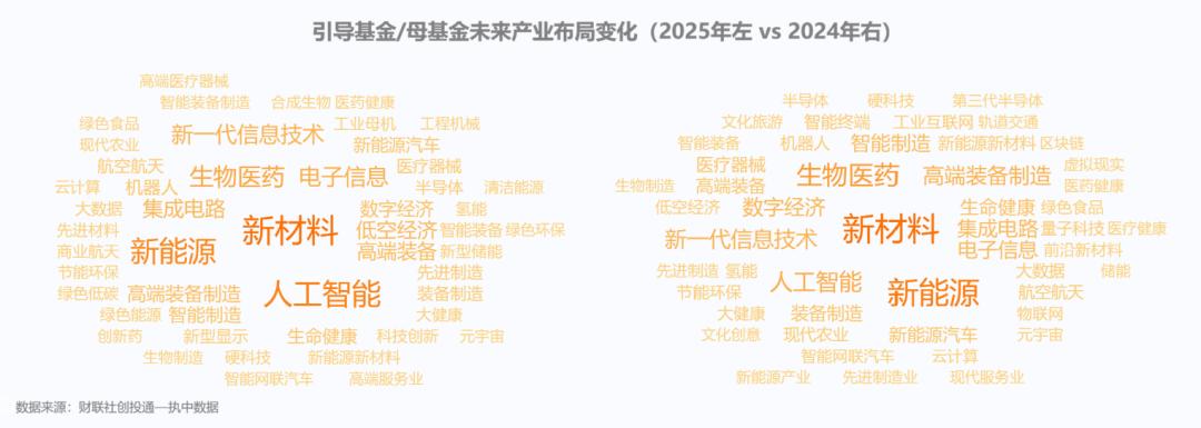 从引导基金遴选动态来看,新材料、人工智能、新能源、生物医药、电子信息是2025年各地引导基金招募关注的重点赛道。与2024年相比,人工智能、电子信息的关注度明显提升。