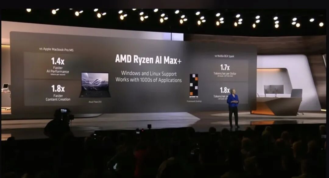 接下来是Ryzen AI Max+系列笔记本处理器,搭载40核RDNA 3.5集成GPU,苏姿丰称,其可以比DGX Spark带来更高的价值,但其计算是每秒token数,相比之下DGX Spark会更加昂贵。