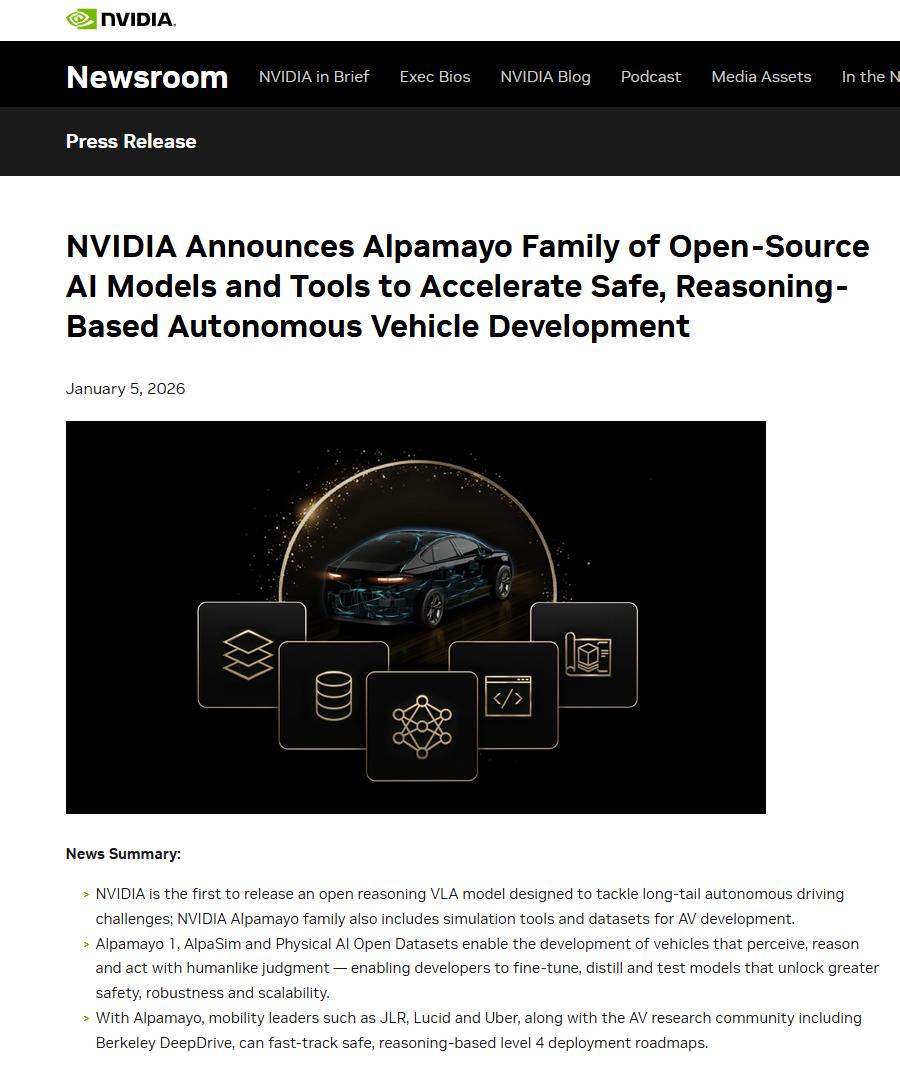 黄仁勋说道:“物理人工智能的ChatGPT时刻已经到来——机器开始理解、推理并在现实世界中行动。无人驾驶出租车是首批受益者之一。Alpamayo为自动驾驶汽车带来了推理能力,使它们能够思考罕见场景,在复杂环境中安全驾驶并解释其驾驶决策——这是安全、可扩展自动驾驶的基础。”