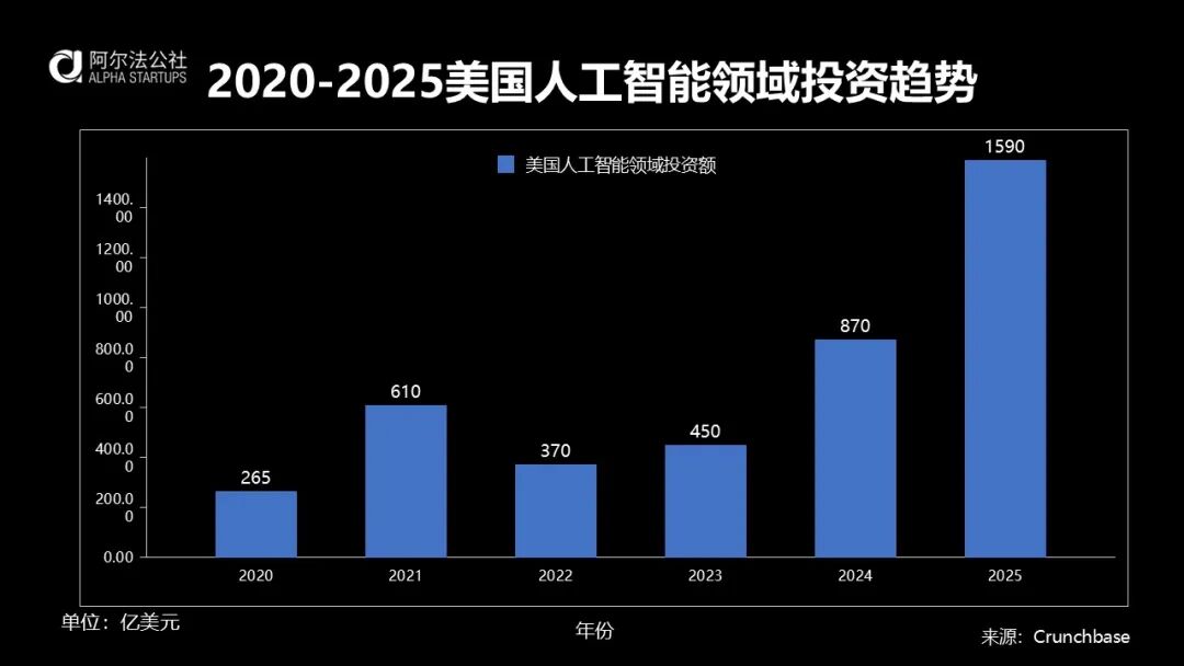 按Crunchbase的统计,美国2024年全年在AI领域累计风险投资金额为870亿美元,2025年截止到12月15日,美国在AI领域的风险投资金额为1590亿美元。